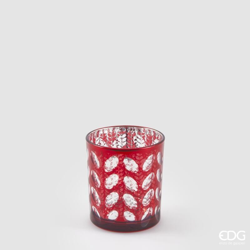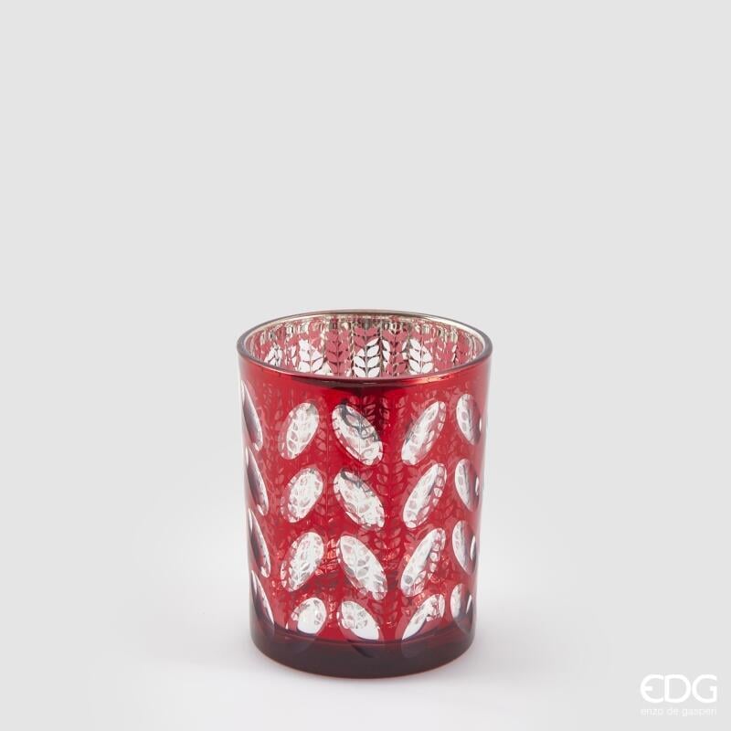 BOUGEOIR EN VERRE FEUILLES EFFET MIROIR H12,5 D10 / ROUGE