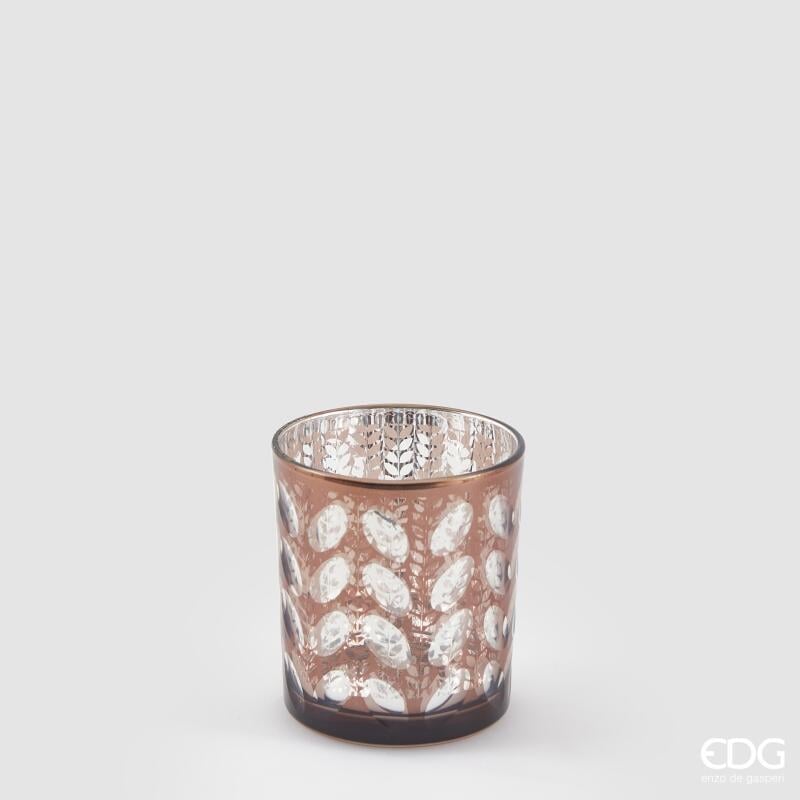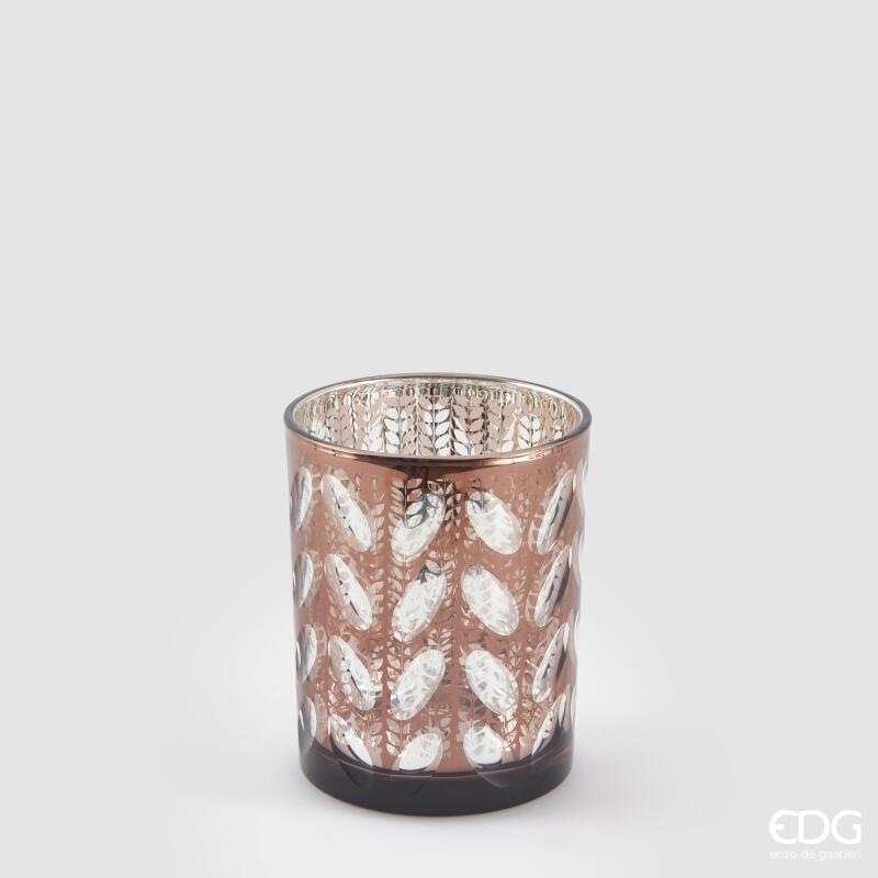 BOUGEOIR EN VERRE FEUILLES EFFET MIROIR H12,5 D10 / ROSE
