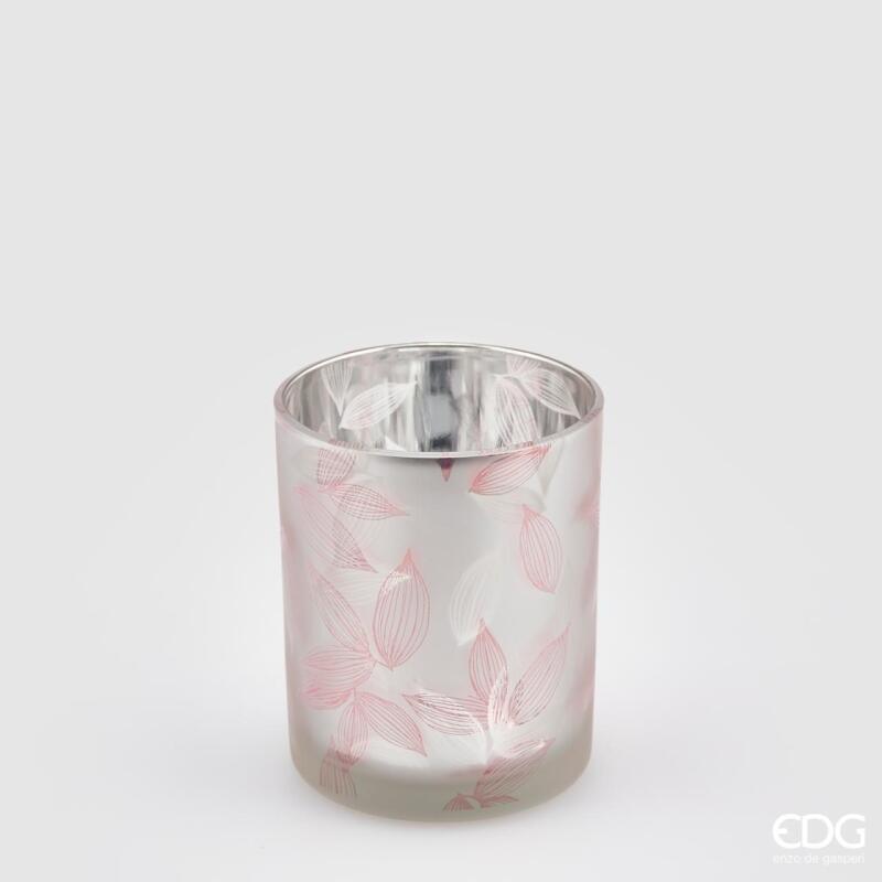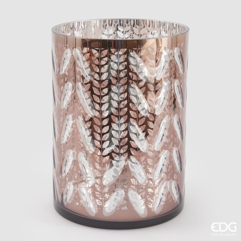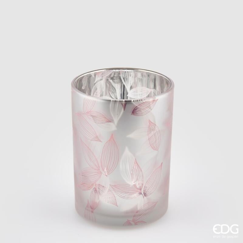 BOUGEOIR EN VERRE FEUILLES EFFET MIROIR H24 D18 / ROSE