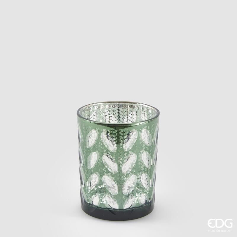 BOUGEOIR EN VERRE FEUILLES EFFET MIROIR H12,5 D10 / VERT FONCÉ