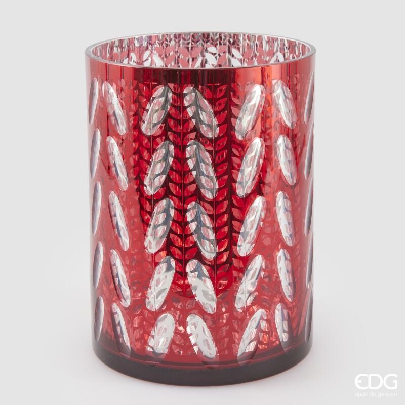 BOUGEOIR EN VERRE FEUILLES EFFET MIROIR H24 D18 / ROUGE