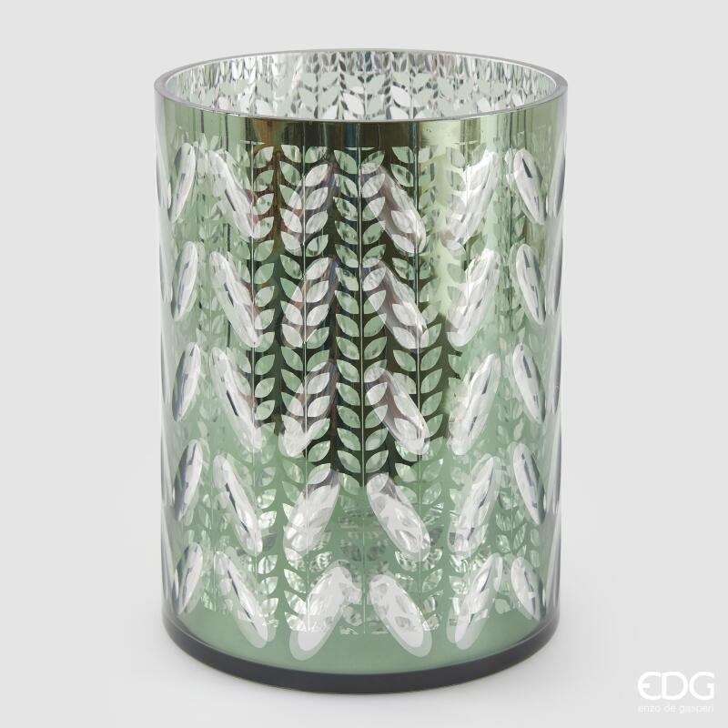BOUGEOIR EN VERRE FEUILLES EFFET MIROIR H24 D18 / VERT FONCÉ